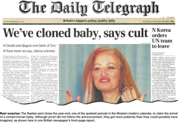 – “…Much has been made of the company Clonaid, which is owned and operated by Raëliens, and claims to have already created at least one human clone, amid great scientific and ethical controversy. The child is said to be a girl named Eve living in Israel. Clonaid’s mission is to create human clones that grow rapidly as spare parts and new bodies for aging humans”