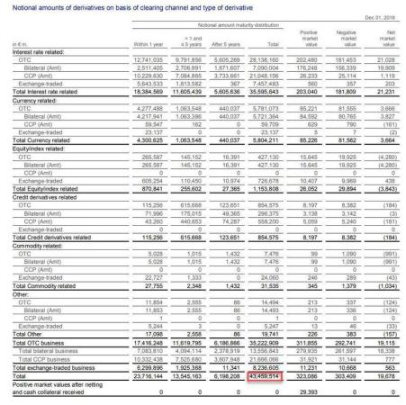 During 2018, the serially troubled Deutsche Bank – which still has a vast derivatives footprint in the U.S. as counterparty to some of the largest banks on Wall Street – trimmed its exposure to derivatives from a notional €48.266 trillion to a notional €43.459 trillion (49 trillion U.S. dollars) according to its 2018 annual report. A derivatives book of $49 trillion notional puts Deutsche Bank in the same league as the bank holding companies of U.S. juggernauts JPMorgan Chase, Citigroup and Goldman Sachs, which logged in at $48 trillion, $47 trillion and $42 trillion, respectively, at the end of December 2018 according to the Office of the Comptroller of the Currency (OCC). (See Table 2 in the Appendix at this link.)