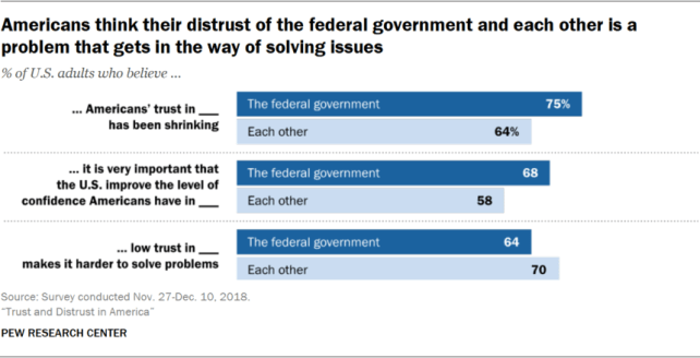 Pew Research Center is a nonpartisan fact tank that conducts public opinion polls and social science research and informs the public about issues, attitudes, and trends shaping the world. The organization recently published a new report called Trust and Distrust in America, which reveals that Americans think declining trust in the government and in each other is making it harder to solve important problems.