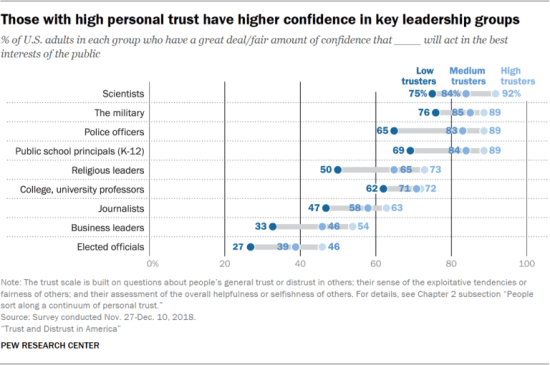 For instance, high trusters often have significantly more positive views about their fellow Americans’ civic and political behaviors than do medium or low trusters. The gaps are particularly striking when it comes to how much confidence high trusters and low trusters express in Americans’ willingness to treat others with respect (54 percentage point gap between the high and low trust groups), respect the rights of people who are not like them (48 points), do what they can to help others in need and obey federal and state laws (both have 45-point gaps), accept election results regardless of who wins (43 points) and honestly report their full income when paying taxes (38 points). (source)