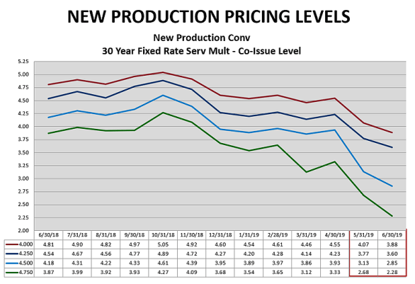 From December 2018 through June, we saw the 4.75% coupons in conventional mortgage servicing fall from 3.8x annual cash flow to 2.3x annual cash flow. So as you listen to the NRZ earnings call early Tuesday morning, pay close attention to the markdown on servicing. And also ponder the fact that the State of New York has decided to get involved with the bankruptcy of Dietech, a troubled residential loan servicer with close ties to NRZ.