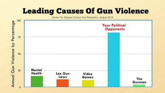 “An exhaustive new study from the CDC reveals that the leading cause of gun violence in America is your political opponents. Researchers looked at a number of potential causes of gun violence such as mental health, family situation, cultural shifts, gun laws, rap music, videogames, sugar consumption, and the actual gunman, but by and large, the most prominent cause of gun violence was what most already suspected. The fault lies with those who you disagree with politically”
