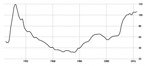 Figure 1: US Gross Federal Debt Ratio (Debt in percent of gross domestic product), 1940–2018. Source: US Bureau of Public Debt, tradingeconomics.com