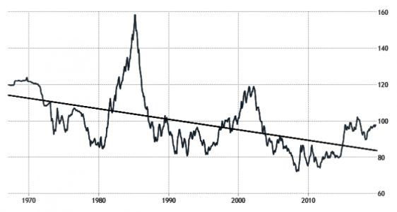 Figure 3: US Dollar Index, 1965–2019. Source: tradingeconomics.com