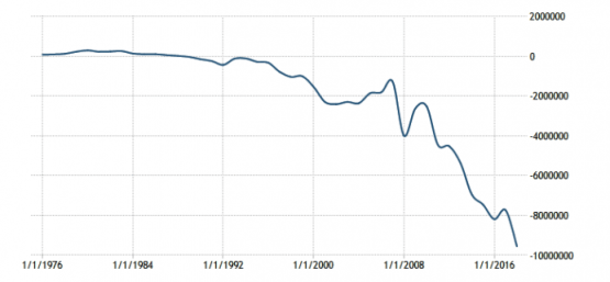 Figure 4: United States net international investment position, 1976–2019 (in million US-dollars). Source:tradingeconomics.com