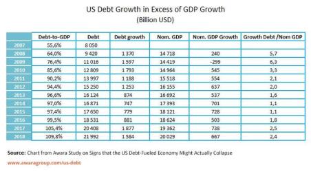 Every year since the last bout of the crisis in 2008, growth of debt in the national economies of each Western country has far exceeded the growth of economic output measured as GDP. Below chart shows just how bad it has been in the US.