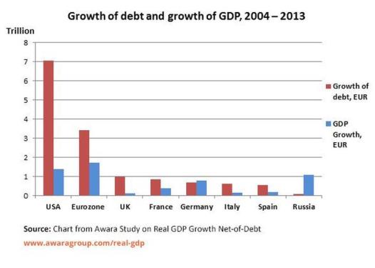 The debt game has been equally miserable all over the West, perhaps with the only exception of Germany, who has wisely refrained from participating, even when egged on by liberal economists calling Germany’s more prudent policy unfair to the gambling nations. Below chart shows how much more the Western governments have borrowed than produced economic growth. The chart covers years 2004 to 2013, but the trend has been the same ever since. GDP growth has been vastly less than the growth of the colossal debtberg.