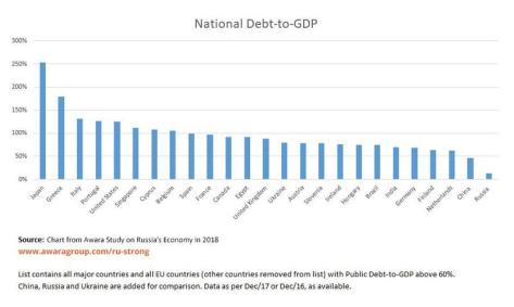 Below chart ranks countries according to their debt burden relative to GDP. And again you see how debtless Russia is compared with the squandering nations.