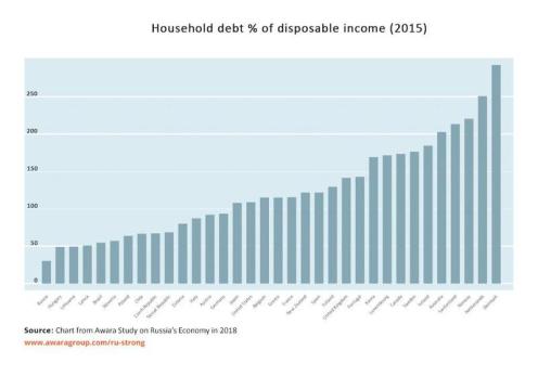 These charts concerned only government debt, when we add private debt to it, the picture is doubly worse. From the point of view of a national economy it really doesn’t matter in which form the excess debt expands, public or private. In fact, on an average in the West the situation with household debt is equally dire. Below chart tells you just how bad. And again note Russia as the one shining exception.