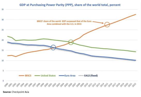 The below chart suggests that the Western countries are already on the way to lose their respective currency monopolies. The BRICS countries (Brazil, Russia, India, China, South Africa) now have a combined GDP (measured in PPP, which is the only correct way to measure the relative size of national economies) larger than not only the G7 countries, but the US and Eurozone economies combined.