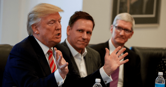 Palantir founder Peter Thiel listens to Trump during a meeting at Trump Tower in New York, Dec. 14, 2016. Evan Vucci | AP