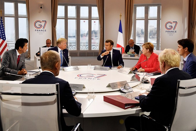 BIARRITZ, FRANCE – AUGUST 25: Canada’s Prime Minister Justin Trudeau, Britain’s Prime Minister Boris Johnson, Germany’s Chancellor Angela Merkel, European Council President Donald Tusk, France’s President Emmanuel Macron, Japan’s Prime Minister Shinzo Abe and US President Donald Trump meet for the first working session of the G7 Summit on August 25, 2019 in Biarritz, France. The French southwestern seaside resort of Biarritz is hosting the 45th G7 summit from August 24 to 26. High on the agenda will be the climate emergency, the US-China trade war, Britain’s departure from the EU, and emergency talks on the Amazon wildfire crisis. (Photo by Jeff J Mitchell – Pool /Getty Images)
