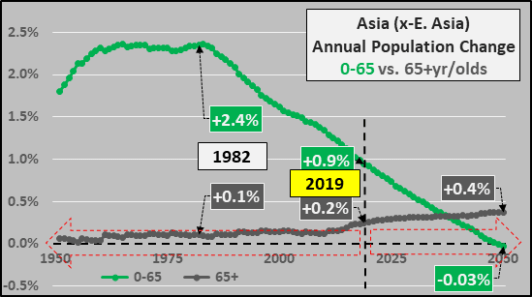 As for the nearly 3 billion inhabiting the remainder of Asia who consume 17% of global energy (excluding East Asia), the annual under 65 year-old population growth has decelerated from a 2.4% annual peak in 1982 to 0.9% in 2019. Annual under 65 year old growth is anticipated to turn negative prior to 2050 and 65+ year old annual growth to gently move higher.