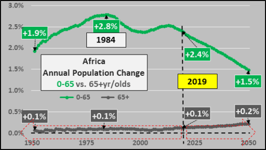 As for the 670 million who inhabit the remainder of the Western hemisphere (who consume 5% of global energy), growth of the under 65 year old population is rapidly decelerating and anticipated to end before 2040. Growth of the 65+ year-olds is anticipated to mildly accelerate.