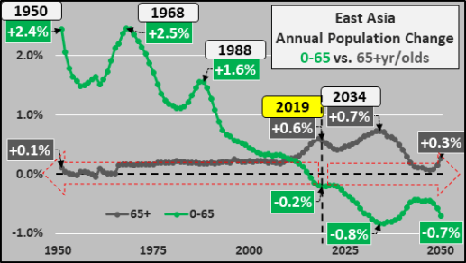 East Asia (China, Japan, S+N Korea, Taiwan, Mongolia) has a total population of 1.67 billion and consumes about 31% of total global energy. In 2016, the under 65 year old population began declining and will decline by 0.2% in 2019. Through 2050, the East Asia under 65 year old population will continue shrinking by as much as 0.8% annually and is projected to decline by 280 million (almost a 20% decline in under 65 year-olds over the next three decades). Meanwhile 65+ year old growth (a net liability and responsibility of the under 65 year old population) will continue growing through 2050 and is projected to increase by 225 million (a 105% increase).