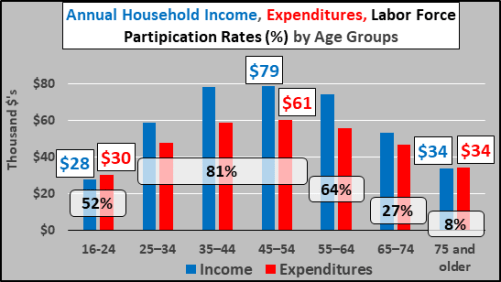 Why the focus on under 65 year-olds? Income, spending, and labor force participation are a bell curve. Household income and expenditures more than double from early adulthood to peak earning, spending, labor force participation from age 45 to 54 years-old. From there, everything falls off and by age 75+, income and spending are nearly back to early adulthood levels but labor force participation falls to just 8%. The chart below details this in the US, and although the dollar amounts and participation rates vary, the dynamics are similar globally. (BTW – easiest to think of the 55 to 64 year-olds as the go-go retirement years, the 65-74 year-olds as the slow-go retirement years, and the 75+ year-olds entering the no-go retirement years…with commensurate spending).