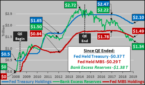 An update on the Fed’s balance sheet (Treasuries and MBS plus bank excess reserves held at the Federal Reserve. Charted below from 2008 through this week, are Fed held Treasuries (blue line), Fed held MBS (red line), and Bank Excess Reserves held at the Federal Reserve (green line). As noted below, since QE ended, bank excess reserves held at the Fed have declined more than double the decline in the Fed’s assets.