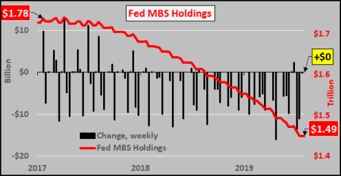 Federal Reserve held MBS (mortgage backed securities, red line) versus weekly change (black column) since September of 2017. The Fed has communicated that it will continue selling off MBS while purchasing Treasuries.