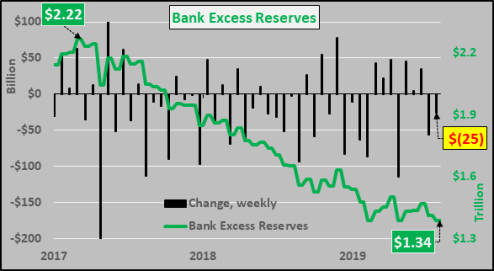 Interestingly, Bank Excess Reserves held at the Federal Reserve continue to tumble, down by $25 billion this week.unmatched by balance sheet reductions.