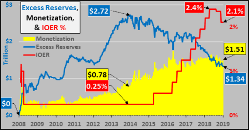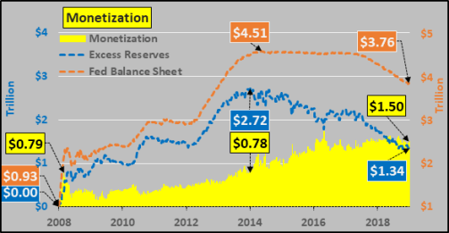 Since QE ended, Bank Excess Reserves have fallen twice that of combined Fed Treasury and MBS holdings.this difference is direct monetization.
