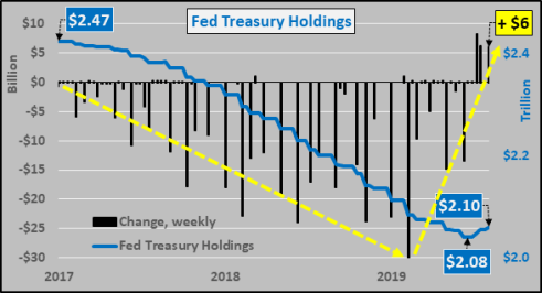 Federal Reserve held Treasuries (blue line) versus weekly change (black column) since September of 2017. The deceleration of QT, the pivot, and restart of Treasury purchasing is easy to see.