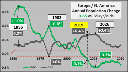 Asia’s primary customers for their exports are Europe and N. America with a combined population of 1.1 billion (consuming 43% of global energy). The combined Europe / N. America under 65 year old population began declining in 2014 and will decline 0.1% in 2019 while the 65+ year old population will grow 0.4%. Europe / N. America’s population trends will mirror East Asia’s with persistent shrinkage of the under 65 year old population through 2050 (almost a decline of 75 million over the next three decades…and that assumes continued migrant inflows) versus persistent growth of the 65+ year old population (nearly 100 million more by 2050).