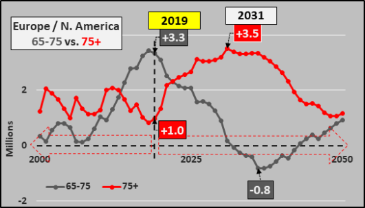 However, of the annual elderly population growth among Europe / N. America, over 75 million will be 75+ versus “just” 20 million more 65 to 75 year-olds. Population growth among the “no-go” (low consumption) older retirees will be the dominant feature among the consumer nations of the world through 2050.