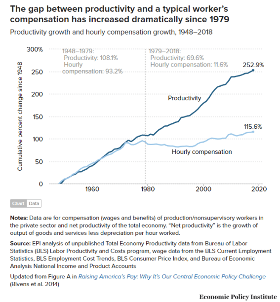 Other theories include the rise of automation, increased female participation in the workforce, and corporate greed. Blaming automation implies that automation was not happening from the 1940s through the early 1970s, or was at least not significant enough to affect worker pay until then, and that it has happened much faster since the 70s. There’s no objective way to measure automation to test that theory, but as automation is one of the driving factors behind increased worker productivity, it seems like automation should be increasing the availability of goods and services to each worker. Shouldn’t automation result in an economy where most people can get more stuff for less work, rather than the same amount of stuff for more work? There’s no good explanation for why automation would result in stagnating worker pay, especially as jobs become more high tech and require a more educated middle class that should be able to demand higher wages relative to poorly educated and low skill workers. Instead, it is precisely that highly educated middle class who have taken the biggest hit to their wages. As for women in the workforce, much like the stagnant minimum wage, this appears to be more a symptom of a greater problem than the cause – the rise of second wave feminism in the 70s occurred as pay was stagnating, and was likely driven at least in part by women needing to work outside the home more to make up for their husbands’ stagnant pay. And considering the significant increases in productivity and automation, workers ought to be able to provide for their families without needing their wives to work as there should be more resources available per worker today than there were a few decades ago when fewer women worked outside the home. As for corporate greed, corporations were just as greedy from the 1940s until the early 70s as they are today, and simply blaming greed does nothing to explain how the elite are able to siphon more money out of the economy today than they did decades ago. A better explanation is needed.