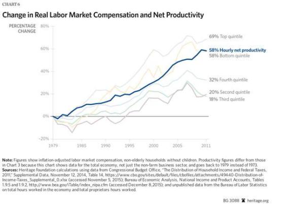 There is, of course, some disagreement over EPI’s findings. Right wing sources like the Heritage Foundation claim that worker pay is actually rising at about the same rate as productivity. Their main disagreement with EPI’s findings is due to the fact that EPI doesn’t include management workers and self-employed professionals in their estimate of worker pay. When those groups are included, pay did in fact increase at almost the same rate as productivity – however, as the Heritage Foundation notes, only the top 20% of earners saw their earnings rise at a faster rate than productivity since the 70s, while the middle 60% saw far lower growth in their pay, so their findings are of little comfort to a majority of American workers, particularly the shrinking middle class.