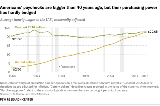 One final analysis, this one from BLS data published by Pew Research and Statista, both of whom look only at wages and not productivity, actually suggests the situation may be even worse than EPI’s data suggests – where EPI shows wages grew by about 25% of their 1948 value from 1972-2018, Pew shows worker pay peaking in 1973, falling from the mid 70s through the mid 90s, and rising slowly from the mid 90s until now with a significant jump during the 2008 recession. According to Statista, 2019 was the first year wages rose above their 1973 value – by about $0.05 cents an hour in 2019 dollars.