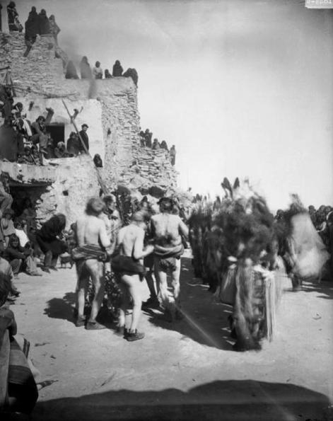 Kachina dancers, Shongopavi pueblo, Arizona, sometime before 1900 ( Public Domain )