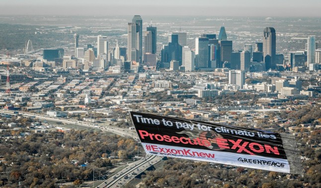 A Greenpeace banner flies over the skyline of Dallas, Texas, Thursday, Dec. 3, 2015. The banner reads Exxon: Time to pay for climate lies and Prosecute Exxon ExxonMobil is currently under investigation by the New York Attorney General to determine if the company lied about the risks of climate change. ExxonMobil’s corporate headquarters is in nearby Irving.