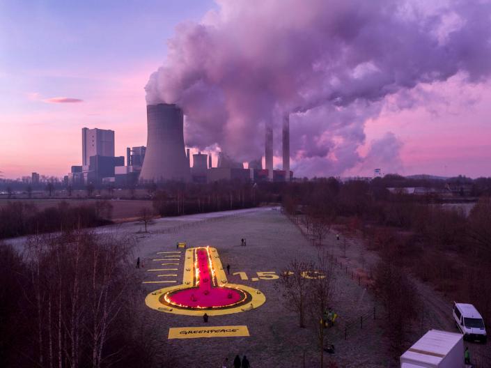Etwa 60 Greenpeace Aktivisten protestieren für den Kohleausstieg am Kraftwerk Niederaußem. Das Kraftwerk gehört zu den klimaschädlichsten Europas.