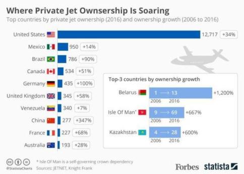 The top 50 countries in the world in terms of private jet ownership have a total fleet of nearly 18,000 jets. According to Statista, private jet ownership is soaring in most countries (as wealth inequality accelerates thanks to central bank interventions and 10 years of Cantillon Effects).