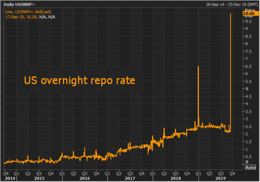 There have been two spikes in the overnight general collateral rate – one at the end of 2018, which was a first warning shot, and the one of last week, which was the biggest such spike on record, exceeding even that seen in the 2008 crisis.