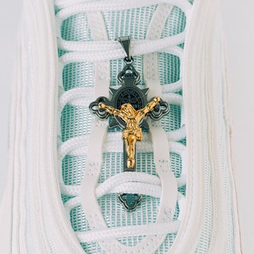 – “…Religious elements include a crucifix that’s been added to the laces, a Bible verse featured along the side of the sneaker, Frankincense (one of the three gifts presented to baby Jesus) scent on the soles, and blessings by a priest, to seal it all together”