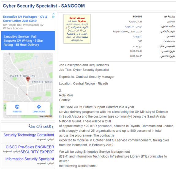 One advert, for a cybersecurity specialist based in Riyadh, reveals that the “Sangcom Future Support Contract” is “a three-year service delivery programme with the client being the UK Ministry of Defence in Saudi Arabia and the customer (use community) being the Saudi Arabia National Guard.”