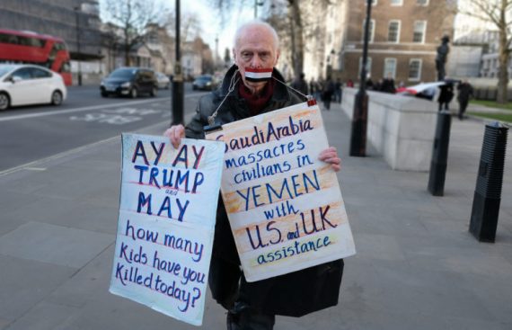 Protester marking third anniversary of the U.K.-backed Saudi terror bombing campaign of Yemen, London, March 2018. (Alisdare Hickson, Flickr, CC BY-SA 2.0, Wikimedia Commons)