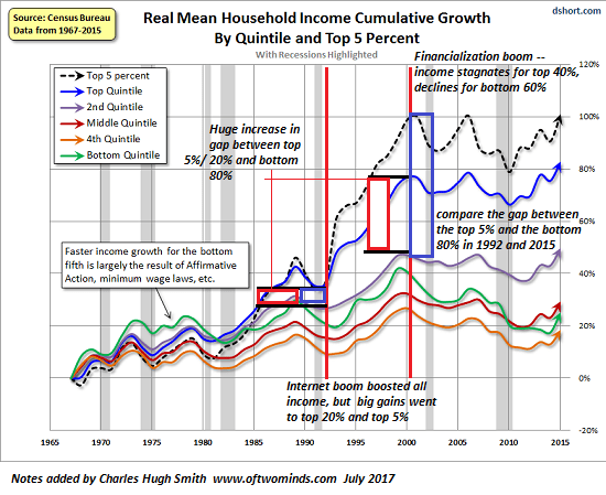 5. “Winner Take Most” Corporate America / market-economy households: top managers and salespeople, entrepreneurs, successful business owners, speculators in financialization/asset bubbles, marketers, those earning substantial royalties, etc. Most work crazy-hard and make sacrifices, as per this article from The Atlantic: Why You Never See Your Friends Anymore: Our unpredictable and overburdened schedules are taking a dire toll on American society.