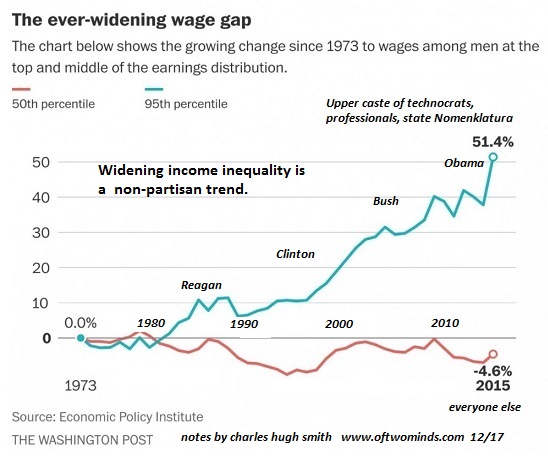 The Working/Middle Class gets nothing but lip-service, and that’s been the case for decades. The political parties and the media abandoned the Working/Middle Class long ago, buttering their bread with the soaring wealth of the Aristocracy / Oligarchy and relegating everyone outside the Protected Class who labors for their livelihood to the servitude of politically impotent tax donkey / debt-serfdom.