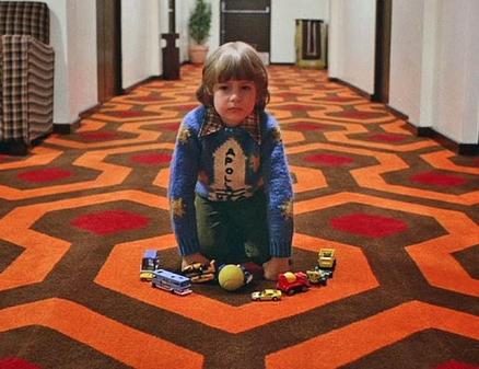 Two scenes in particular give the keys to this cryptic narrative. The first one is when Danny (representing Kubrick’s child, that is, the Apollo films) rises up wearing an Apollo 11 sweater, on a rug with a design similar to the Launch Complex from which the Apollo rockets were launched. Soon after, Danny enters room n°237, which contains the secret of the hotel. The room number was 217 in King’s novel, but Kubrick changed it to 237 in reference to the distance of 237,000 miles that separates the earth from the moon (according to the common estimation at the time). The “room n°237” is in fact the “moon room”, because “room” looks similar to “moon” when read backward, and Kubrick has taught us to read words backward in the scene where the word “redrum” becomes “murder” in the mirror.