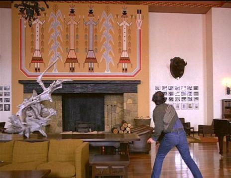 Besides these two scenes, there are a number of other clues that support this subtextual reading. Why did Kubrick, for example, make the design of the Indian tapestry in the main lounge resemble rockets? Does Jack aiming at them with a ball represent Kubrick “shooting” the Apollo films?