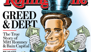 “…Mitt Romney, it turns out, is the perfect frontman for Wall Street’s greed revolution. He’s not a two-bit, shifty-eyed huckster like Lloyd Blankfein. He’s not a sighing, eye-rolling, arrogant jerkwad like Jamie Dimon. But Mitt believes the same things those guys believe: He’s been right with them on the front lines of the financialization revolution, a decades-long campaign in which the old, simple, let’s-make-stuff-and-sell-it manufacturing economy was replaced with a new, highly complex, let’s-take-stuff-and-trash-it financial economy”