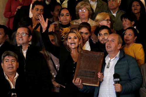 Bolivian Senator Jeanine Anez gestures as she poses for a picture after she declared herself as Interim President of Bolivia, at the Presidential Palace, in La Paz, Bolivia November 12, 2019