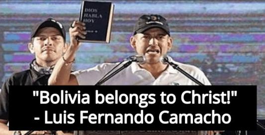 – “…One of the coup’s leaders, the head of the Santa Cruz paramilitary organisation Luis Fernando Camacho, entered the government palace after Morales’ resignation together with a priest and placed a Bible on the Bolivian flag. For his part, the priest proclaimed that “Bolivia belongs to God” and that the Pachamama, a goddess revered by the indigenous people in the country, would never return to it”