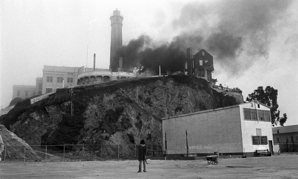 View of the fire on June 2, 1970, which burned most of the night on Alcatraz Island, destroying the lighthouse, warden’s home, and infirmary of the former federal penitentiary. John Trudell (Sioux) stands in the foreground. He lived on the island with his family.
