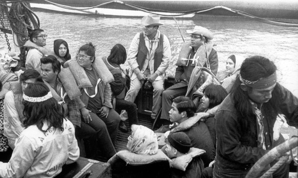 Indian elders from throughout the country joined the young occupiers of Alcatraz Island for a meeting they said was the most important since the ‘Ghost Dance’ days of the 1880s. Indians board a boat at Fisherman’s Wharf to be taken to the island, which has been occupied by 150 to 200 Indians since Nov. 20, to join in a pow-wow to decide on the future course of American Indians.