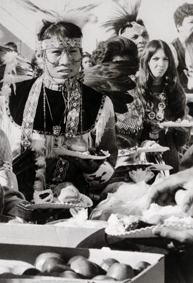 (Original Caption) The Indian invaders of Alcatraz feasted on Thanksgiving turkey and the trimmings 11/27 inside the barbed wire topped walls of the former prison’s recreation area. A young brave from Nogales, New Mexico is in the foreground getting his share of the Thanksgiving fare. A San Francisco restaurant prepared the feast and Sausalito yachtsmen delivered it to the Indians.