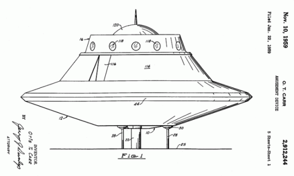 Over a decade later, Carr succeeded in getting a patent for his revolutionary flying saucer craft, which he called an amusement park device in order to get it approved by the US Trade and Patent Office. After raising private funding to build his OTC-XI, he successfully tested his flying saucer in 1961. According to one of Carr’s former employees, Ralph Ring, the saucer incorporated high voltage machines for its propulsion and navigation systems.