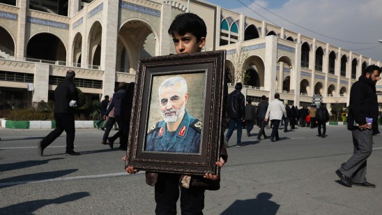 A boy carries a portrait of Gen. Qassem Soleimani in Tehran, Iran, Jan. 3, 2020. Iran has vowed “harsh retaliation” for the assassination of Soleimani. Vahid Salemi | AP